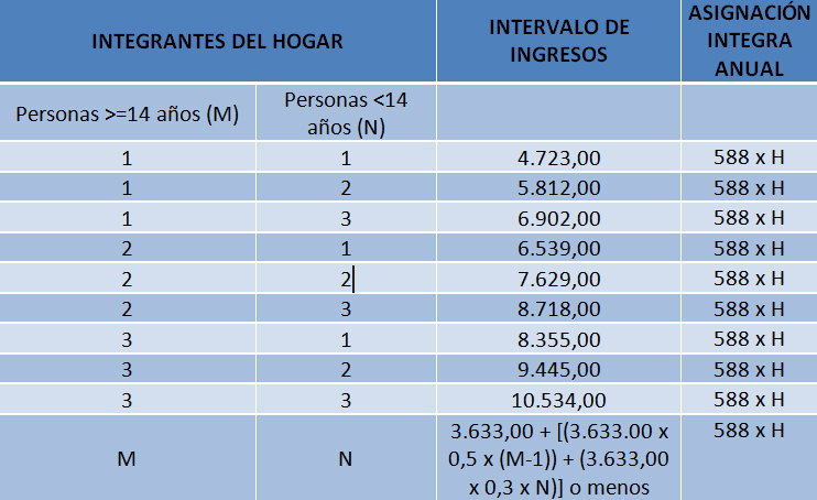 *En 2020, y conforme al Real Decreto-ley 1/2020, de 14 de enero, el límite de ingresos será de 12.424,00 euros/año incrementándose en un 15 por ciento por cada hijo o menor a cargo, a partir del segundo (incluido). En el supuesto de familias numerosas, el límite de ingresos es de 18.699,00 euros/año, incrementándose en 3.029,00 euros por cada hijo a cargo a partir del cuarto (incluido).