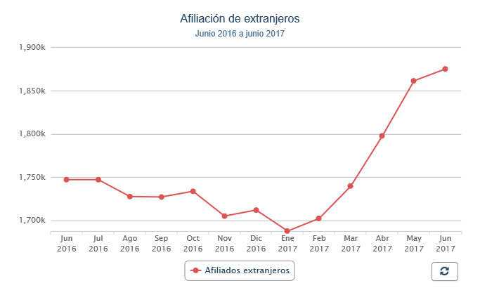 En este mes la ocupación ha aumentado un 0,74%, lo que supone 13.822 trabajadores más. Respecto al año pasado, el número de afiliados extranjeros aumenta un 7,30%, 127.612 personas ocupadas más que en 2016.