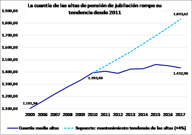 A destacar que en los cálculos de la AIREF se contabiliza el efecto moderador sobre el gasto en pensiones que realiza la reforma de 2011, cuya repercusión se percibe ya en la ruptura de la tendencia de las altas en pensiones (ver gráfico adjunto). De los factores considerados que compensarán el efecto demográfico, el más intenso de hecho es la reforma de las pensiones de 2011. Estos efectos, todavía relativamente incipientes (se calcula que solo han operado el 37% de los efectos de esta reforma), suelen ser, a pesar de su notable entidad, sorprendentemente subestimados en muchos de los comentarios y valoraciones que se realizan sobre el gasto futuro en pensiones y su sostenibilidad.