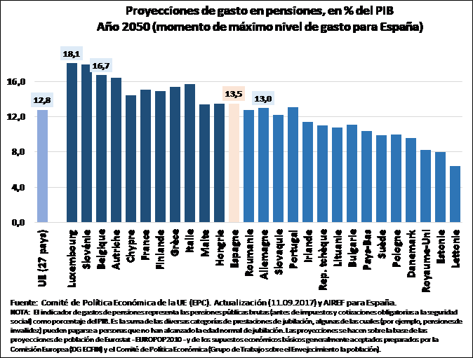 - De tal forma que la AIREF concluye que el impacto de la demografía (jubilación de la generación del baby boom), se verá compensado en su mayor parte por los efectos reductores del gasto en pensiones que conllevarán: a) el mercado de trabajo (es decir, el aumento del empleo), 2,2 puntos del PIB, b) la reforma de las pensiones de 2011, 3,5 puntos del PIB, y c) el Factor de Sostenibilidad, 0,6 puntos del PIB. El resultado neto será un crecimiento del gasto de 2,8 puntos del PIB de aquí hasta 2050. Muy lento al principio, 0,4 puntos del PIB de crecimiento hasta casi 2030, más fuerte después, dos puntos al filo de 2040.
