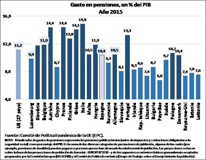 No se trata de un nivel de gasto inasumible teniendo en cuenta el fuerte incremento en el número de pensionistas en España. Y que diez países de la Unión Europea mantendrán niveles de gasto más elevados que el nuestro (véase el gráfico adjunto), según las estimaciones realizadas por el Comité de Política Económica de la Unión Europea.