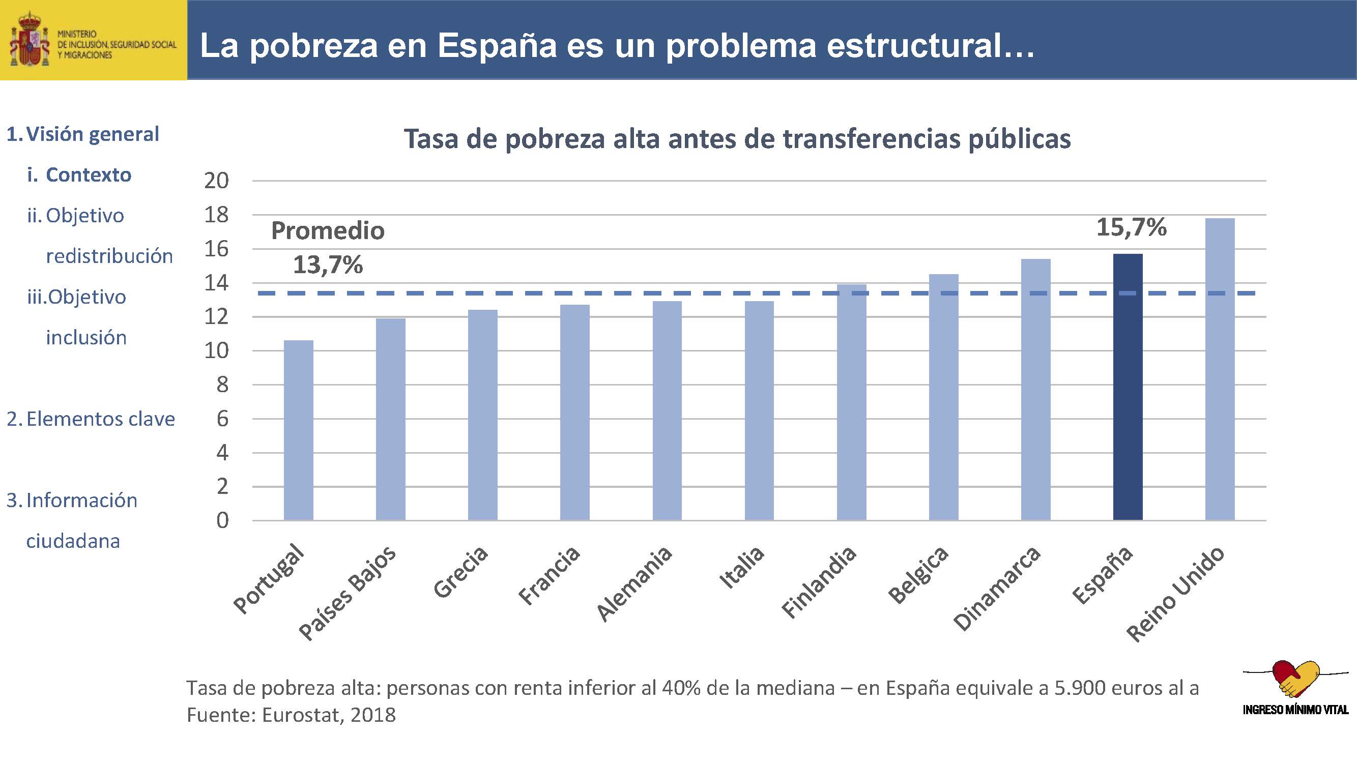 Pero otro de los problemas que pretende atajar el Ingreso Mínimo Vital son las carencias redistributivas de las prestaciones existentes. La tasa de pobreza alta después de las ayudas públicas se mantiene en el 9%, sólo por detrás de Italia si nos fijamos en países de nuestro entorno.
