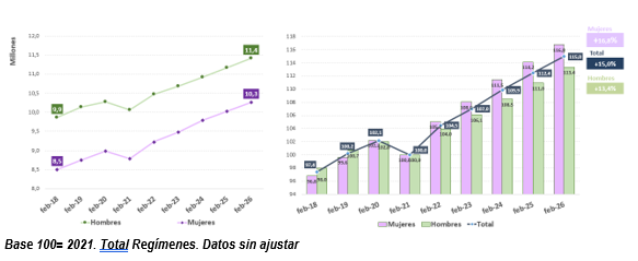 La Seguridad Social suma 13 meses con más de 10 millones de mujeres afiliadas y alcanza los 10.257.248 de ocupadas en febrero. “En pocos días, celebramos el Día Internacional de la Mujer y no hay mejor dato que este: hay más mujeres que nunca trabajando y cada vez en mejores condiciones, con más contratos indefinidos y bases de cotización que van aumentando mes a mes”, explica la ministra Elma Saiz.