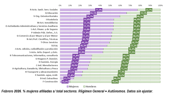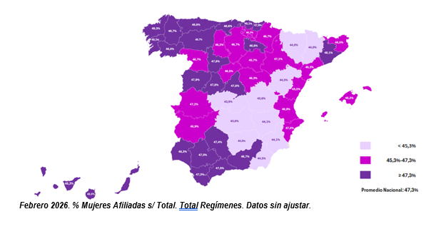 Las mujeres suponen ya el 47,3% del total de afiliados, un punto porcentual más que en 2018. Por provincias, hay 14 que superan el 48%.