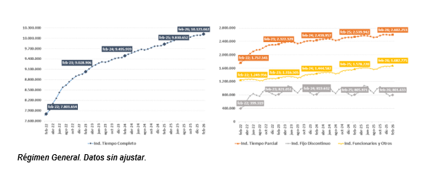 Desde febrero de 2021, se ha producido una gran transformación en los tipos de contratos de nuestro mercado de trabajo: hay 4.716.953 más con contrato indefinido y 1.900.668 afiliados menos con contrato temporal. Cada vez hay más empleos estables, con más derechos y mejores salarios. El mayor incremento se produce entre los contratos indefinidos con jornada a tiempo completo, con 293.011 más que hace un año. Mientras que los contratos a tiempo parcial aumentan en 62.311.