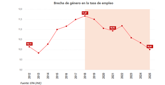 Como resultado, la evolución favorable de la afiliación femenina contribuye a que continúe reduciéndose la brecha de género en la tasa de empleo, con un descenso acumulado del 14% desde 2018.