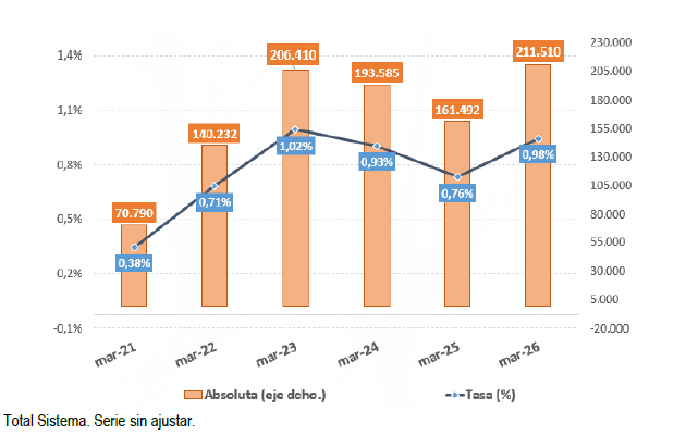 Las cifras también son de récord en afiliación media. La Seguridad Social ha registrado 21.882.147 afiliados, con 524.501 ocupados más que hace un año y 211.510 más solo en el último mes, lo que lo convierte en el mejor mes de marzo desde que hay registros. La afiliación diaria se ha mantenido por encima de los 21,9 millones desde el día 16 al día 30 de marzo.