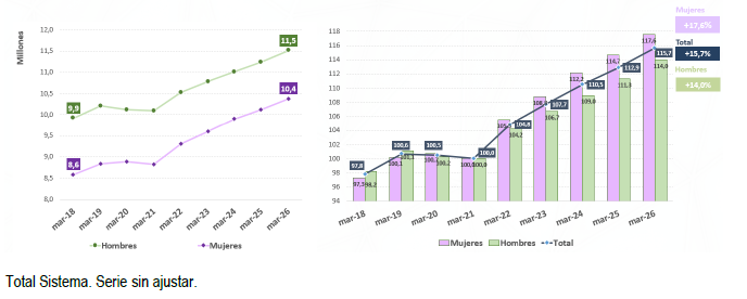 Las mujeres suponen el 47,4% del total de afiliados, un punto porcentual más que en 2018. Su presencia en el mercado laboral crece a un ritmo del 2,53% con respecto a 2025.
