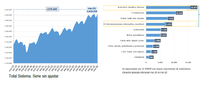 En el caso de los trabajadores autónomos, es significativo el crecimiento interanual en Telecomunicaciones, Programación Informática, Consultoría e Infraestructura Informática, que crece un +10,9%.
