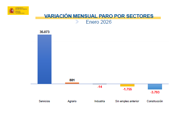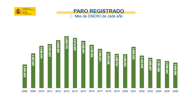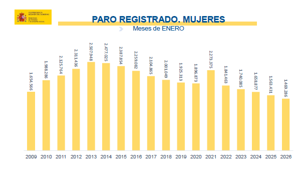 El desempleo femenino aumenta en 25.284 mujeres (1,75%) hasta las 1.469.283 en relación al mes de diciembre. Es la cifra más baja en un mes de enero en los últimos 18 años. Con respecto al mes de enero de 2025 el paro femenino cae en 94.148 (-6,02%).