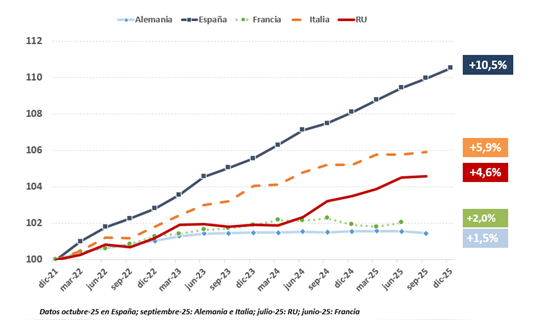 El empleo en España (+10,5%) sigue creciendo a un ritmo superior al de otras economías europeas (Italia, +5,9%; Francia, +2%; Alemania, +1,5%), con referencia a datos de finales de 2021, antes de la entrada en vigor de la reforma laboral.