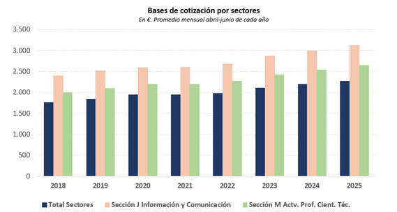 Por ejemplo, la base media de cotización de Información y Comunicaciones es de 3.120 euros mensuales, frente a los 2.269 de promedio de todos los sectores del periodo abril-junio.