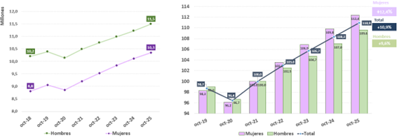 El número de mujeres afiliadas a la Seguridad Social continúa en cifras históricamente altas, con 10.344.599. Son 109.972 ocupadas más que en septiembre, mientras el número de hombres afiliados crece 31.955. La mejoría en el empleo entre las mujeres es del 12,4% desde antes de la reforma laboral, 2,8 puntos más alta que la de los hombres.