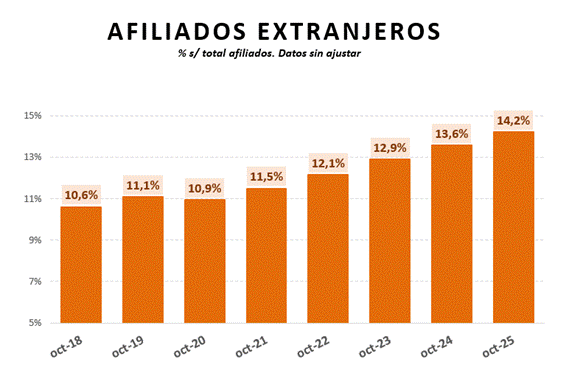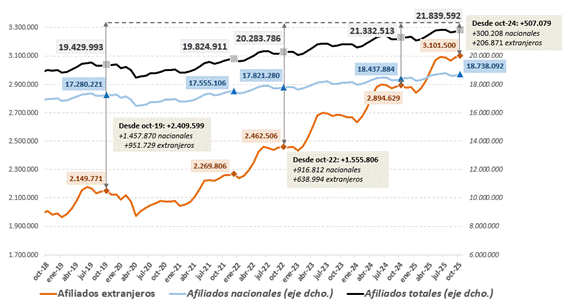 La Seguridad Social ha registrado 3.100.999 afiliados extranjeros en octubre si se descuenta el efecto calendario. Por primera vez, la cifra de trabajadores procedentes de otros países supera los 3,1 millones, tras sumar más de 200.000 ocupados en los últimos doce meses (206.837), lo que supone un +7,15% de variación interanual.