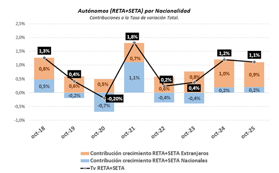 La afiliación de trabajadores por cuenta propia de otros países ha alcanzado en octubre un nuevo máximo: 494.246 personas, un 6,6% más que hace un año. Su crecimiento está muy por encima de la media del conjunto de afiliados, cuyo crecimiento ha sido del 1,1%.
