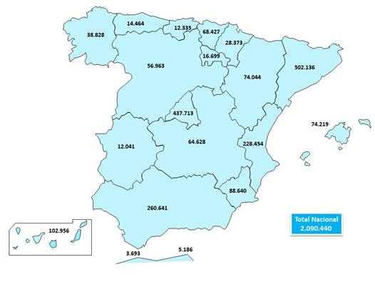 Los grupos de trabajadores extranjeros más numerosos procedieron de Rumanía (335.573), Marruecos (265.699), Italia (124.160) y China (106.613). Les siguieron los trabajadores nacionales de Colombia (74.061), Ecuador (71.281), Reino Unido (67.797), Venezuela (66.782) y Bulgaria (59.404).