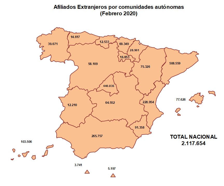 De febrero de 2019 a febrero de 2020, la afiliación de extranjeros se incrementó en todas las comunidades autónomas. Galicia (11,67%), Cantabria (11,25%), Navarra (10,53%) y País Vasco (10,12%) fueron las autonomías que más trabajadores foráneos sumaron. A continuación se situaron Asturias (8,63%), Castilla y León (8,47%) y Aragón (8,16%).