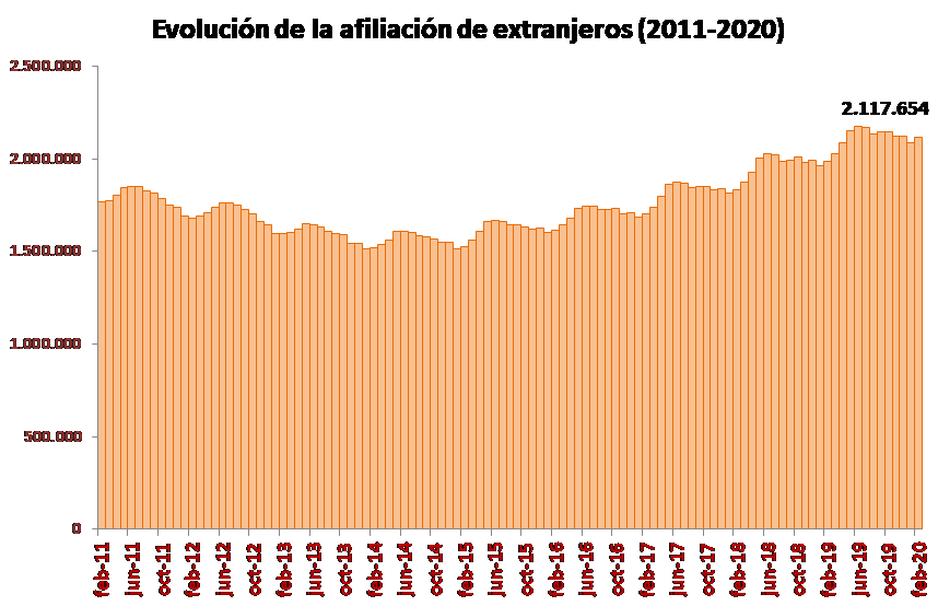 La Seguridad Social registró una media de 2.117.654 trabajadores extranjeros en febrero, lo que representa el 11,08% del conjunto de la afiliación. En el último mes, el número de ocupados con nacionalidad foránea sumó 27.214 trabajadores (1,3%). Por otro lado, el incremento de la afiliación de este colectivo fue de 132.374 activos respecto a febrero de 2019. Esto situó la variación interanual en el 6,67%.