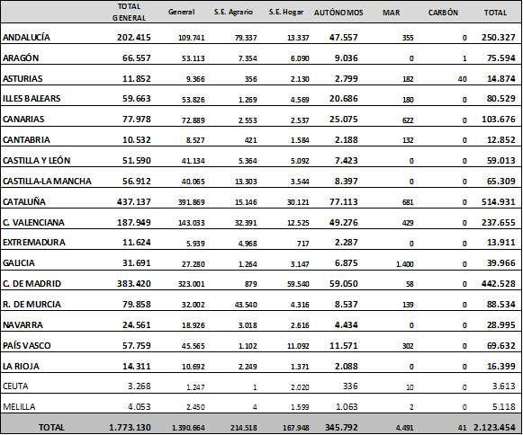 Por regímenes, la mayoría de los afiliados extranjeros está encuadrada en el Régimen General, 1.773.130 (este dato incluye el Sistema Especial Agrario, con 214.518 ocupados, y el de Hogar, con 167.948). Le siguen el Régimen de Trabajadores Autónomos, con 345.792 afiliados, el Régimen Especial del Mar, con 4.491, y el del Carbón, con 41.