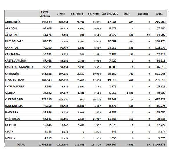 Por regímenes, la mayoría de los afiliados extranjeros está encuadrada en el Régimen General, 1.798.918 (este dato incluye el Sistema Especial Agrario, con 216.548 ocupados, y el de Hogar, con 167.706). Le siguen el Régimen de Trabajadores Autónomos, con 345.944 afiliados, el Régimen Especial del Mar, con 4.859, y el del Carbón, con 50.