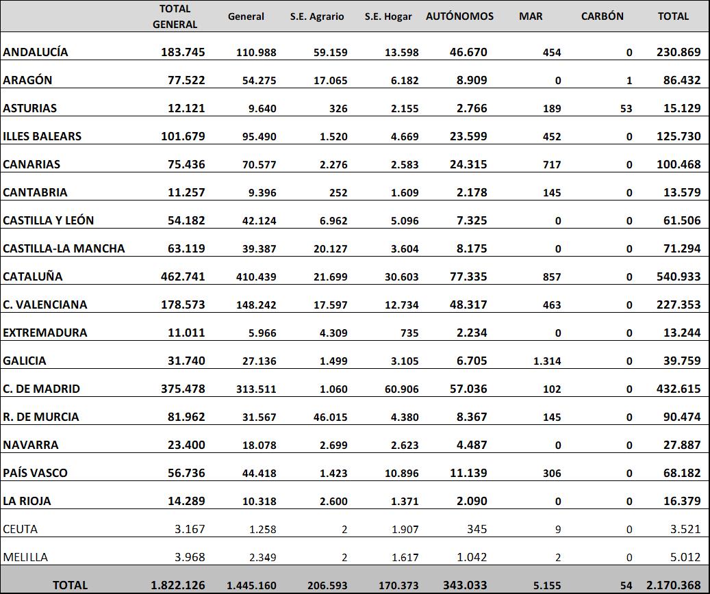 Por regímenes, la mayoría de los afiliados extranjeros está encuadrada en el Régimen General: 1.786.138 (este dato incluye el Sistema Especial Agrario, con 189.349 ocupados, y el de Hogar, con 168.823). Le siguen el Régimen de Trabajadores Autónomos, con 341.541 personas, el Régimen Especial del Mar, con 5.175, y el del Carbón, con 53.