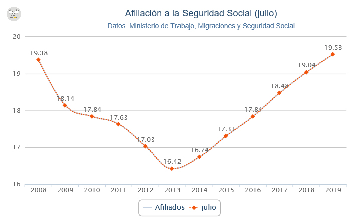 La afiliación media aumentó en julio en 15.514 (0,08%) y en los últimos 12 meses, en 490.401 (2,58%). En términos desestacionalizados, se incrementó con respecto a junio en 4.334 trabajadores.