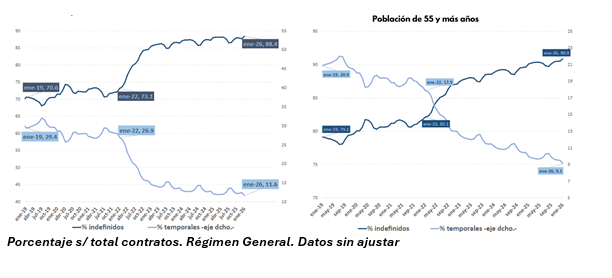 El peso de los trabajadores temporales se encuentra en el 11,6%, frente al 29.4% que suponía en enero de 2019. Esta mejoría es aún más destacable entre los trabajadores de 55 y más años, que tienen una tasa de temporalidad del 9,1% cuando hace siete años tenían una superior al 20%.