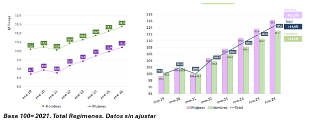 El número de mujeres afiliadas a la Seguridad Social continúa en cifras históricamente altas para un mes de enero, con 10.211.265 de media. Son 235.397 ocupadas más que hace un año; mientras que hay 242.420 afiliados más que hace un año, lo que suma un total de 11.362.366 trabajadores varones. La mejoría en el empleo de las mujeres es del +16,3% desde el año previo a la reforma laboral, 3,2 puntos porcentuales más alta que la de los hombres.