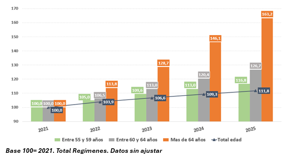 Resulta especialmente relevante el aumento en los trabajadores del grupo de más de 64 años, que ha crecido 51,4 puntos por encima de la media.