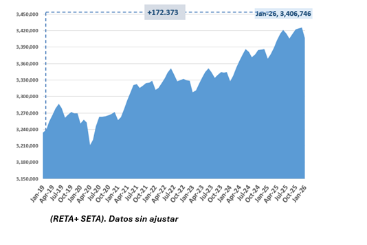 La Seguridad Social registra en enero un aumento de 477.818 afiliados respecto a un año antes