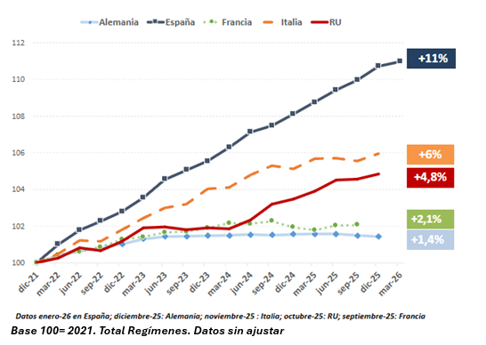 El mercado de trabajo en España (+11%) sigue marcando un ritmo de crecimiento superior al de otras economías europeas (Italia, +6%; Francia, +2,1%; Alemania, +1,4%), con referencia a datos de finales de 2021, antes de la entrada en vigor de la reforma laboral.