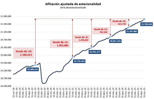 En el último año, la afiliación ha crecido en 494.312 ocupados. Desde los niveles previos a la reforma laboral, diciembre de 2021, el incremento es de 1.961.044 afiliados.