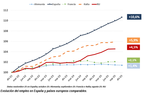 El mercado de trabajo en España (+10,6%) sigue marcando un ritmo de crecimiento superior al de otras economías europeas (Italia, +5,9%; Francia, +2,1%; Alemania, +1,4%), con referencia a datos de finales de 2021, antes de la entrada en vigor de la reforma laboral.