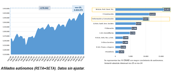 Desde noviembre de 2024, la afiliación de trabajadores por cuenta propia en los sectores de Información y Comunicación y Actividades Profesionales, Científicas y Técnicas se ha incrementado en un 10,5% y 4,7%, respectivamente.