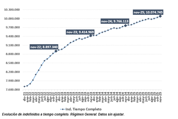El mercado laboral suma 522.771 afiliados en los últimos doce meses, hasta registrar un total de 21.825.233 ocupados en la serie original en noviembre, el nivel más elevado en ese mes. Supone un ritmo de creación de empleo del 2,5% interanual.
