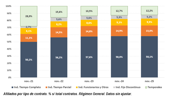 Desde diciembre de 2021, se ha producido una gran transformación en los tipos de contratos de nuestro mercado de trabajo: hay 4.211.387 afiliados más con contrato indefinido y 2.155.630 afiliados menos con contrato temporal. Cada vez hay más empleos estables, con más derechos y mejores salarios. El mayor incremento se produce entre los indefinidos con contrato indefinido a tiempo completo, con 308.632 más que hace un año. Mientras que los contratos a tiempo parcial aumentan en 85.961.