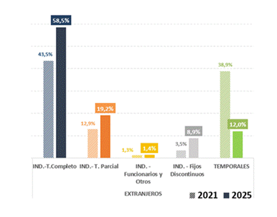 No solo se crea más empleo, sino que además es de mayor calidad para todos los trabajadores. Tal es así que los contratos indefinidos a tiempo completo de los trabajadores extranjeros han sido los que más representación han ganado desde 2021, y ya son el 58,5% del total (+15pp). Igualmente, aumenta el porcentaje de contratos indefinidos a tiempo parcial que pasan del 12,9% a representar el 19,2% del total. Sin embargo, los contratos temporales experimentan una reducción: al descender del 38,9%, que suponían antes de la reforma laboral, al 12%.