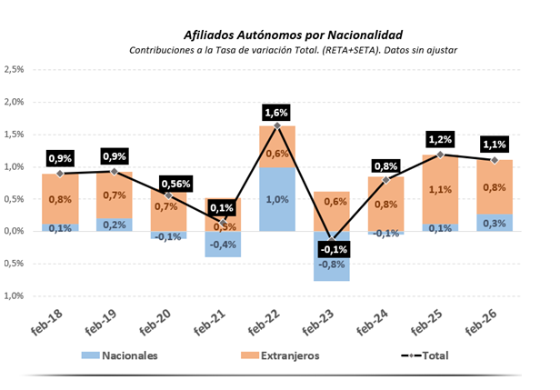 El crecimiento de la afiliación extranjera es especialmente significativo en el trabajo por cuenta propia, que en febrero supera los 500.000 trabajadores (500.037). Este crecimiento es del 6 % respecto al mismo mes de 2025, muy por encima de la evolución del régimen autónomos a nivel global (+1,1%).