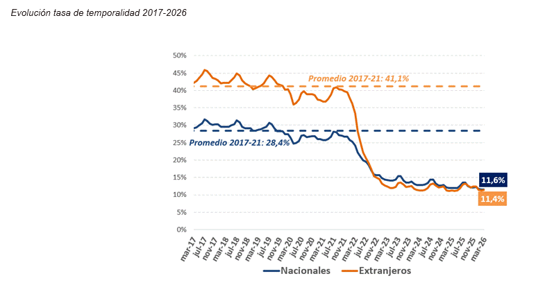 En paralelo, la tasa de temporalidad de este colectivo de trabajadores cae a mínimos históricos, al bajar hasta el 11,4% el porcentaje de afiliados extranjeros con contrato temporal, también por debajo del de nacionales (11,6%). Ese porcentaje contrasta con el promedio del periodo 2017-2021, que alcanzaba el 41,1% del total.