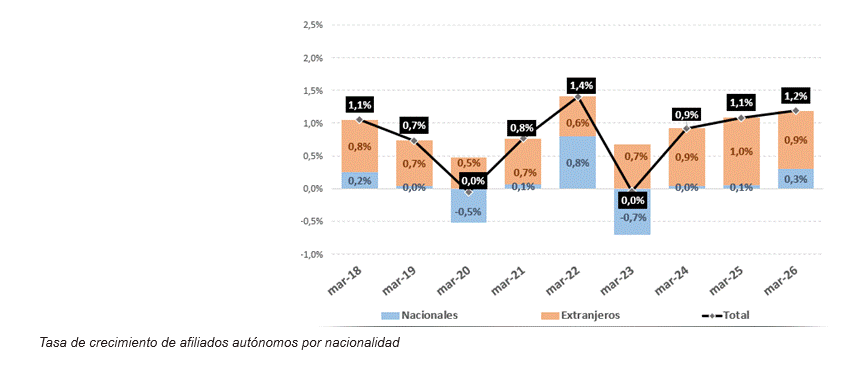 La variación interanual de este colectivo es del 7,9% cuando se descuenta el efecto del calendario, muy por encima del 2,5% de la afiliación general.