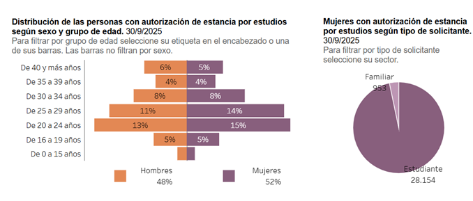 A 30 de septiembre de 2025, un total de 29.107 mujeres tenían una autorización de estancia por estudios en vigor en España, según el Observatorio Permanente de la Inmigración, esto representa el 52% del total de personas con este tipo de autorización.