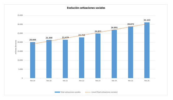 Como ya se ha indicado, en estos dos meses del año, las cotizaciones sociales ascienden a 31.122 millones de euros, lo que supone un incremento del 7,8 % respecto a los ingresos del mismo periodo del ejercicio 2025 (2.251 millones de euros más).
