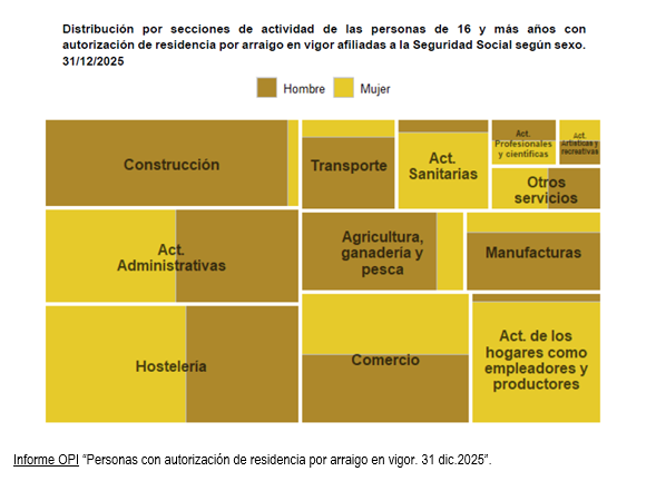 Un total de 214.085 personas de 16 años o más con autorización de residencia por arraigo estaban trabajando y cotizando a la Seguridad Social en nuestro país a 31 de diciembre de 2025. El crecimiento respecto al año anterior es de un 39%, lo que supone un avance significativo en la inserción de este colectivo en nuestro mercado laboral. Así se desprende de los datos difundidos por el Observatorio Permanente de la Inmigración (OPI), adscrito a la Secretaría de Estado de Migraciones, en la estadística más reciente sobre las autorizaciones de residencia por arraigo en España.